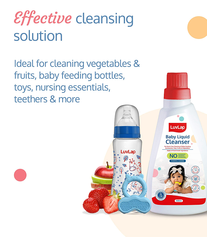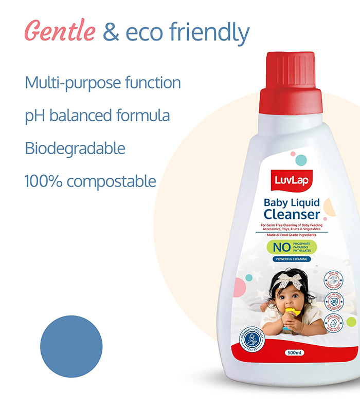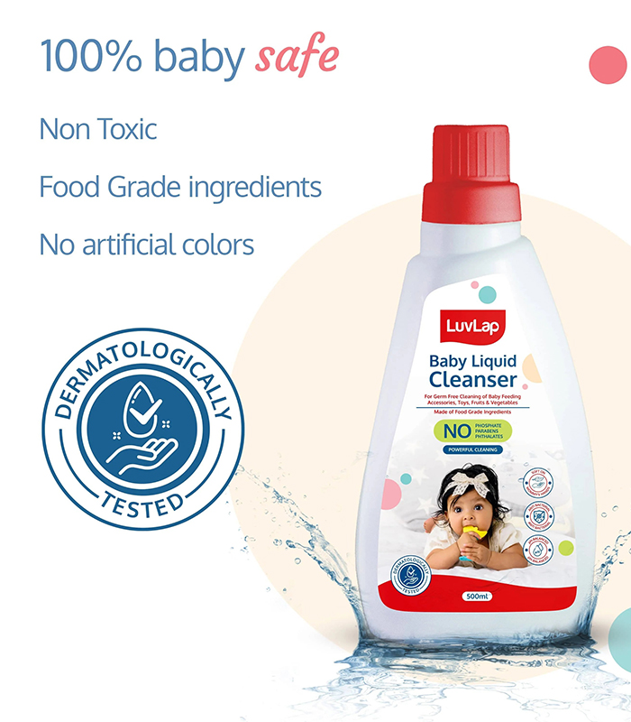 Hello mommies, meet the LuvLap Liquid Cleanser. It is non-toxic food-grade ingredient based formula is tough on stains, kills bacteria & keeps baby items clean. It is dermatologically tested and ensures best hygiene for babies. Better hygiene is the secret for happy, healthy babies.
