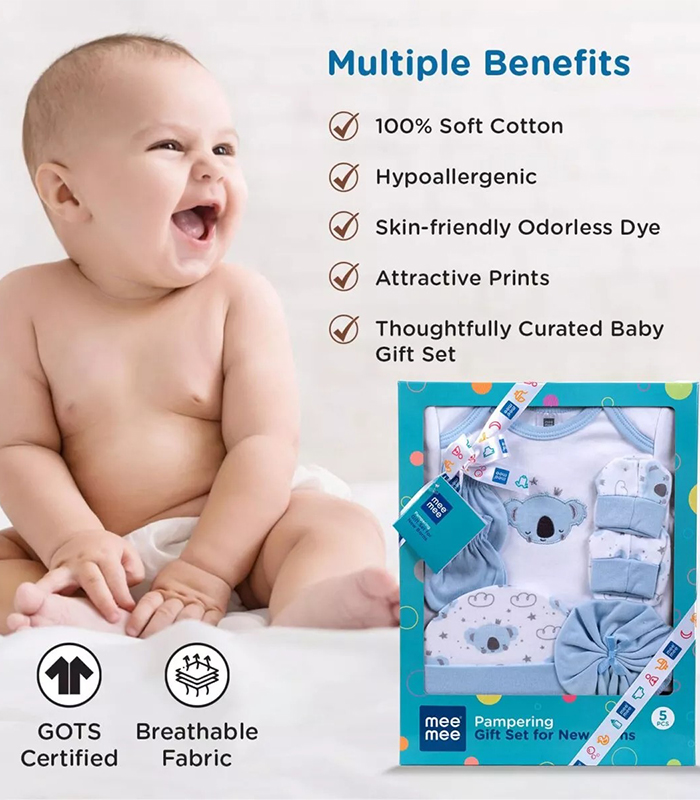 Mee Mee Pampering Gift Set For New Born Baby | Soft Cotton Clothing Essentials for Infants/Baby Girls, Boys | (5 Pieces) Rectangular Shape Gift Box For Kids | 0+Months