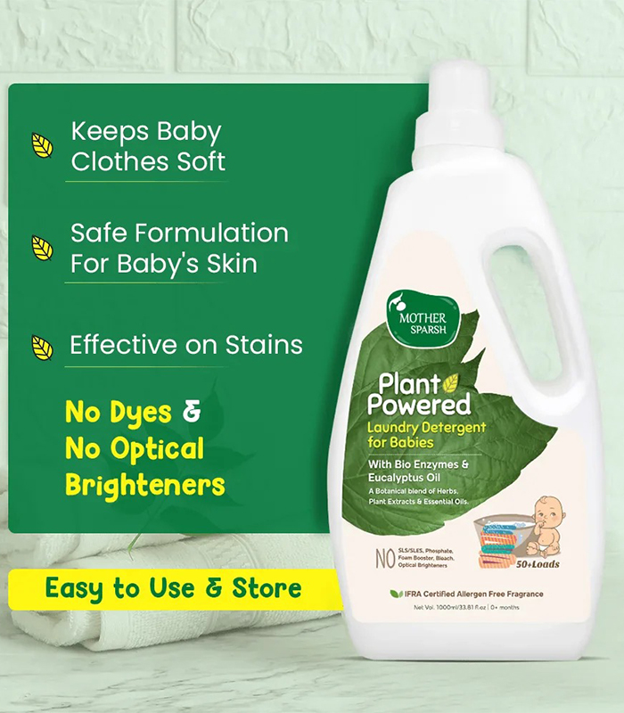 We know that washing baby clothes can be tough! Ordinary detergents can cause rashes and allergies to your baby’s delicate skin. That’s why Mother Sparsh Plant Powered Laundry Detergent is the advanced solution. Our baby laundry detergent, made with organic herbs, plant extracts, and essential oils, is the best detergent for baby clothes both gentle and effective. The bioenzyme formula and eucalyptus oil effortlessly remove dirt while keeping fabrics soft. Plus, it’s free from harmful chemicals like SLS/SLES, phosphate, sulphates, and bleach. Give your baby clothes the best gentle care with our baby detergent.
