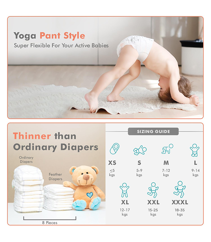 Yoga Pant Style: The XS Size Pant diapers have a high waist and gives your baby 360-degree elasticity to enjoy their playtime and prevent heaviness as well as any discomfort they might face.
