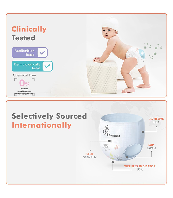 Suits Even Sensitive skin types: Dermatologically and Pediatrician tested, these diapers are chemical-free (0% Parabens/Latex/Fragrance/ Phthalates*/Chlorine*) making it suitable for even babies with sensitive skin types.