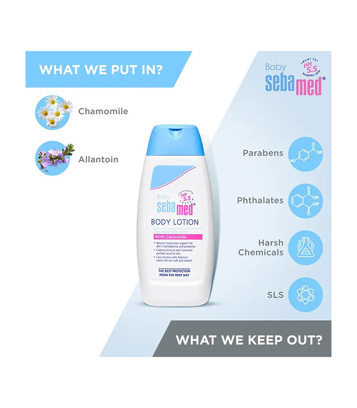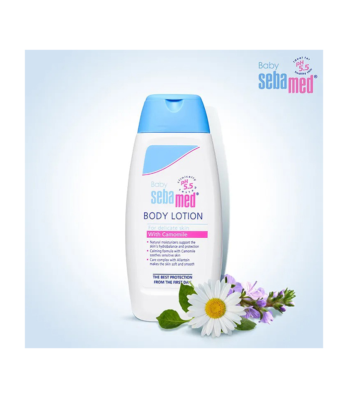 Sebamed Baby Body Lotion is a paediatrician-recommended moisturizing lotion that keeps your baby’s skin moisturized and smooth. It has a pH of 5.5 and is gentle on the baby’s sensitive and delicate skin. It contains natural moisturizers that support the skin’s hydro-balance and protection. It is enriched with a calming formula containing Chamomile that soothes sensitive skin. Its care complex with Allantoin makes the skin soft and smooth, preventing dry, rough, and flaky skin. It is dermatologically tested and safe for newborn skin. It also has a quick-absorbing and non-greasy formula. Regular usage of Sebamed Baby Body Lotion improves the hydration of the baby’s skin.